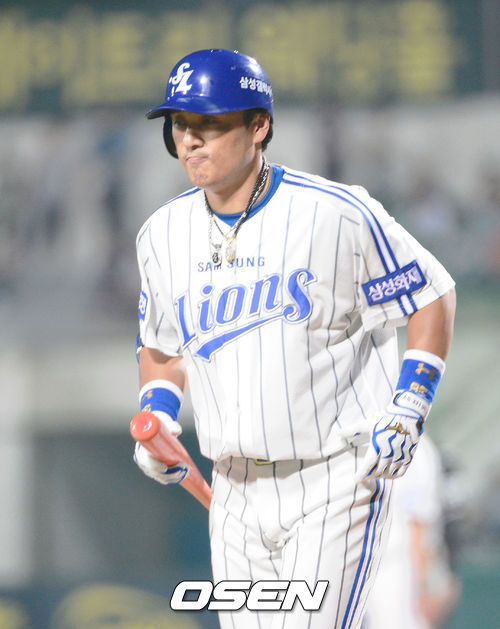 7일 오후 대구구장에서 열린 '2013 한국야쿠르트 세븐 프로야구' 삼성 라이온즈 와 두산 베어스 경기, 8회말 무사 1루 이승엽 내야플라이로 물러나며 아쉬워하고 있다.