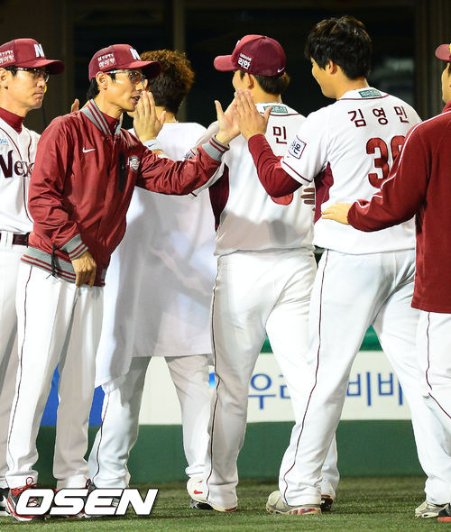 경기를 마치고 넥센 김영민이 염경엽 감독과 하이파이브를 하고 있다. / rumi@osen.co.kr