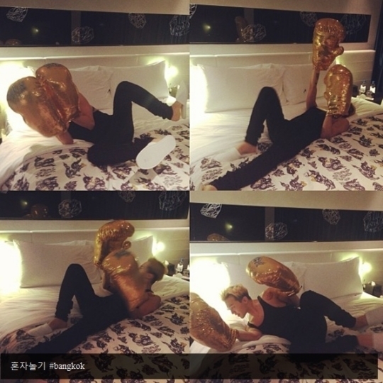 지드래곤은 7일 자신의 SNS에 '혼자 놀기 #bangkok'이라는 짧은 글과 함께 침대 위에서 양손에 황금색 글러브를 끼고 뒹굴거리고 있는 사진 4장을 공개했다.