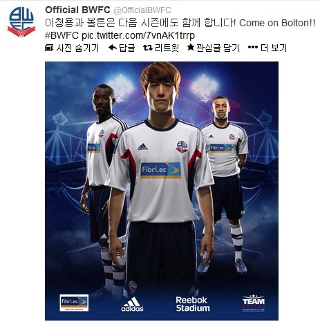 볼튼 원더러스가 7일(이하 한국시간) 구단 공식 트위터를 통해 '블루 드래곤' 이청용(25)과 다음 시즌도 함께 하겠다는 뜻을 밝혔다. 볼튼은 구단 공식 트위터에 "이청용과 볼튼은 다음 시즌에도 함께 합니다! Come on Bolton!!"이라는 한국어 문구와 함께 2013-2014시즌 유니폼 모델로 나선 이청용의 사진을 함께 올렸다.