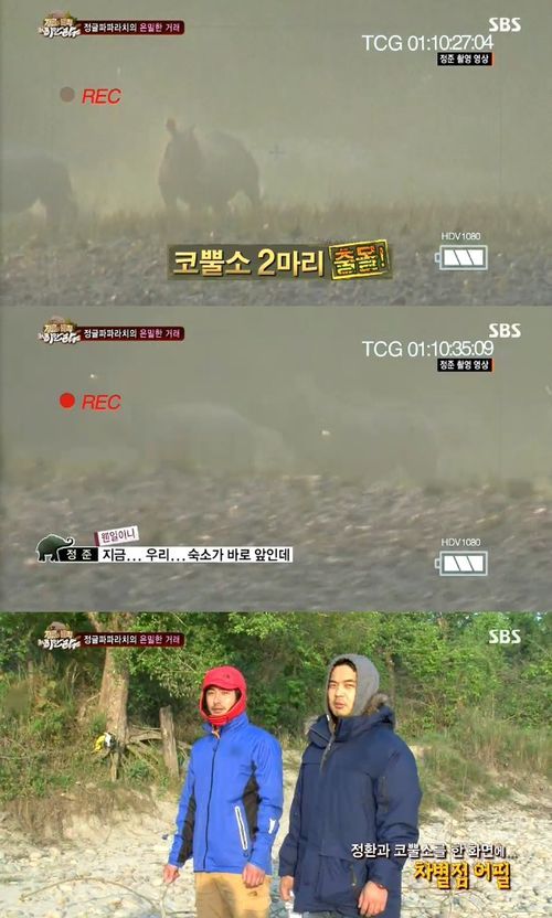 안정환의 말에 정준이 일어나 카메라를 가지고 나가 급하게 코뿔소를 찾았다. 드디어 코뿔소가 뛰어가는 걸 카메라에 담았다.