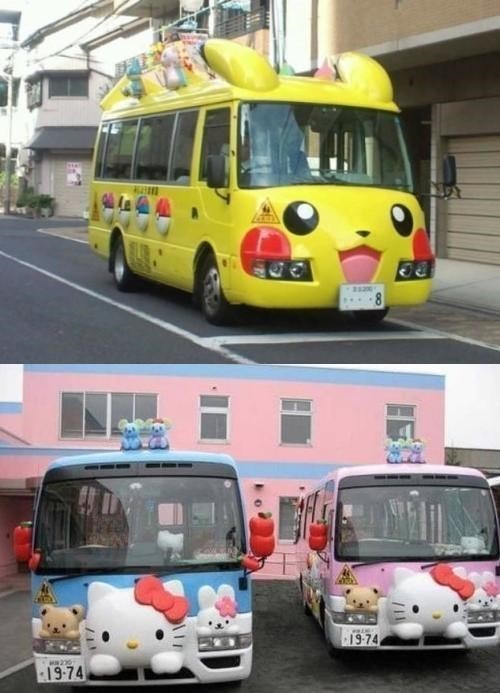 공개된 사진 속에는 일본의 어린이집 버스가 나오는데 '헬로 키티', '피카츄' 등 유명 캐릭터 등을 디자인해 시선을 모으고 있다.