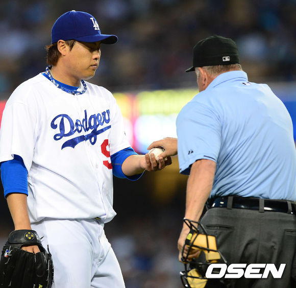 8일 오전(이하 한국시간) 미국 캘리포니아주 로스앤젤레스 다저스타디움에서 LA 다저스와 애틀랜타 브레이브스의 경기가 열렸다. 4회초 애틀랜타 공격 2사 3루 상황 댄 어글라에게 1타점 좌전 안타를 허용한 다저스 선발 류현진이 심판에게 공을 건네받고 있다.