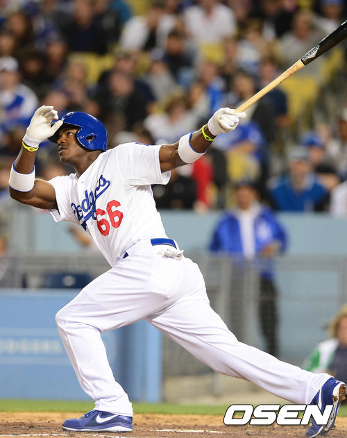 8일 오전(이하 한국시간) 미국 캘리포니아주 로스앤젤레스 다저스타디움에서 LA 다저스와 애틀랜타 브레이브스의 경기가 열렸다. 6회말 다저스 공격 2사 주자없는 상황 1번 야시엘 푸이그가 동점 좌월 솔로포를 터트리고 있다.