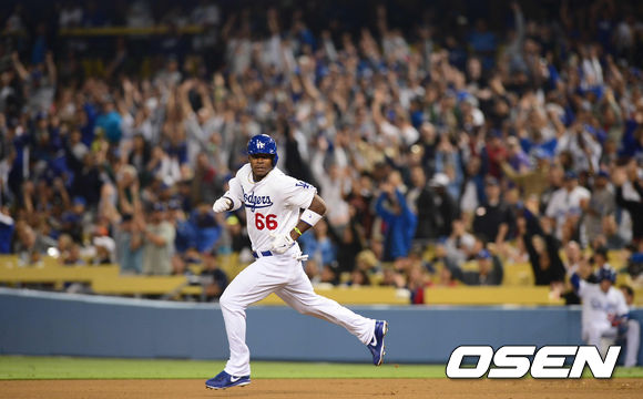 8일 오전(이하 한국시간) 미국 캘리포니아주 로스앤젤레스 다저스타디움에서 LA 다저스와 애틀랜타 브레이브스의 경기가 열렸다. 6회말 다저스 공격 2사 주자없는 상황 1번 야시엘 푸이그가 동점 좌월 솔로포를 터트리고 그라운드를 돌고 있다.