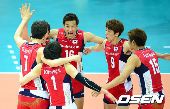 8일 오후 경기도 수원실내체육관에서 열린 '2013 월드리그 국제남자배구대회' 대륙간 라운드 2주차 한국과 핀란드의 경기, 1세트 득점에 성공한 한국 선수들이 환호하고 있다.