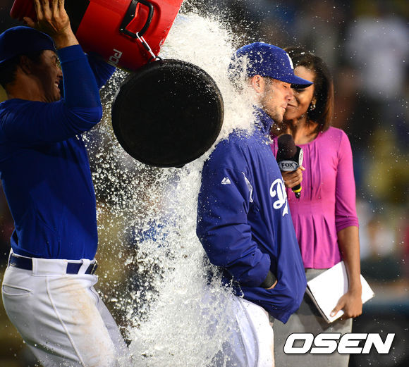 8일 오전(이하 한국시간) 미국 캘리포니아주 로스앤젤레스 다저스타디움에서 열린 LA 다저스와 애틀랜타 브레이브스의 경기 종료 후 슈마커가 인터뷰 중 크루스에게 물세례를 당하고 있다.