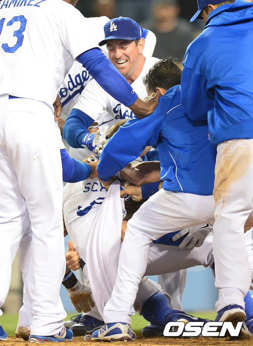 8일 오전(이하 한국시간) 미국 캘리포니아주 로스앤젤레스 다저스타디움에서 열린 LA 다저스와 애틀랜타 브레이브스의 경기 10회말 1사 1,3루 대주자 슈마커가 폭투로 득점 후 동료들의 환호를 받고 있다.