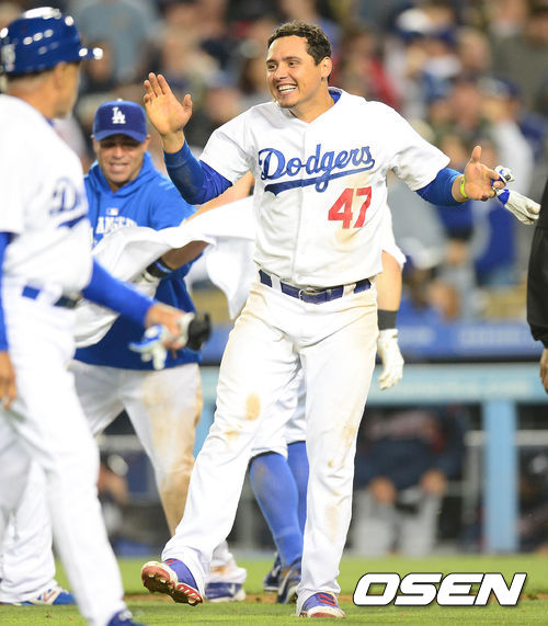 다저스는 8일(이하 한국시간) 미국 캘리포니아주 로스앤젤레스 다저스타디움에서 열린 '2013 메이저리그' 애틀랜타와 홈경기에서 연장 10회말 끝내기 폭투로 2-1 승리를 거뒀다.