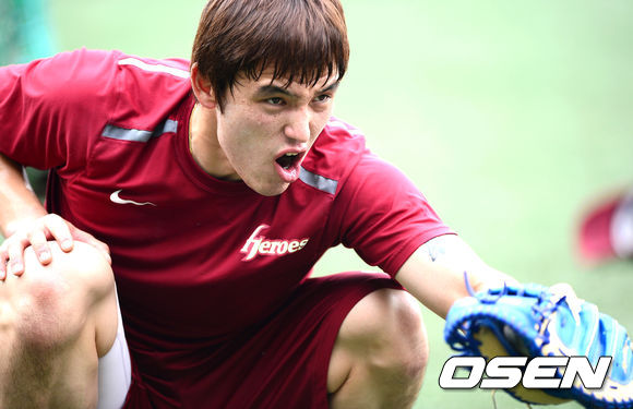 8일 오후 서울 목동야구장에서 열리는 '2013 한국야쿠르트 세븐 프로야구' 넥센 히어로즈와 KIA 타이거즈의 경기, 경기에 앞서 넥센 박동원이 훈련을 하고 있다.