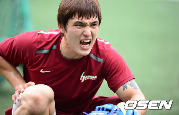 8일 오후 서울 목동야구장에서 열리는 '2013 한국야쿠르트 세븐 프로야구' 넥센 히어로즈와 KIA 타이거즈의 경기, 경기에 앞서 넥센 박동원이 훈련을 하고 있다.