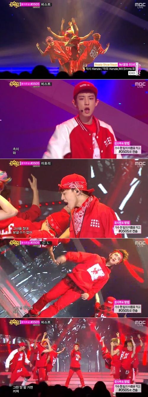 8일 방송된 MBC ‘쇼!음악중심’에서 엑소는 신곡 ‘늑대와 미녀’로 무대를 꽉 채우는 화려한 퍼포먼스를 펼쳐냈다. 특히 이날 멤버들은 붉은 늑대를 연상케 하는 의상으로 강렬한 눈빛과 절도있는 퍼포먼스를 선보이며 타 그룹과는 차원이 다른 무대를 완성했다.