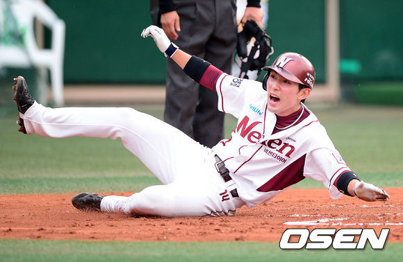 8일 오후 서울 목동야구장에서 열린 '2013 한국야쿠르트 세븐 프로야구' 넥센 히어로즈와 KIA 타이거즈의 경기, 1회말 1사 2루에서 넥센 이택근의 선제 우전 적시타에 서건창이 홈에서 세이프되고 있다.