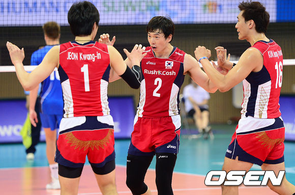 2세트 득점에 성공한 한국 선수들이 환호하고 있다. /sunday@osen.co.kr