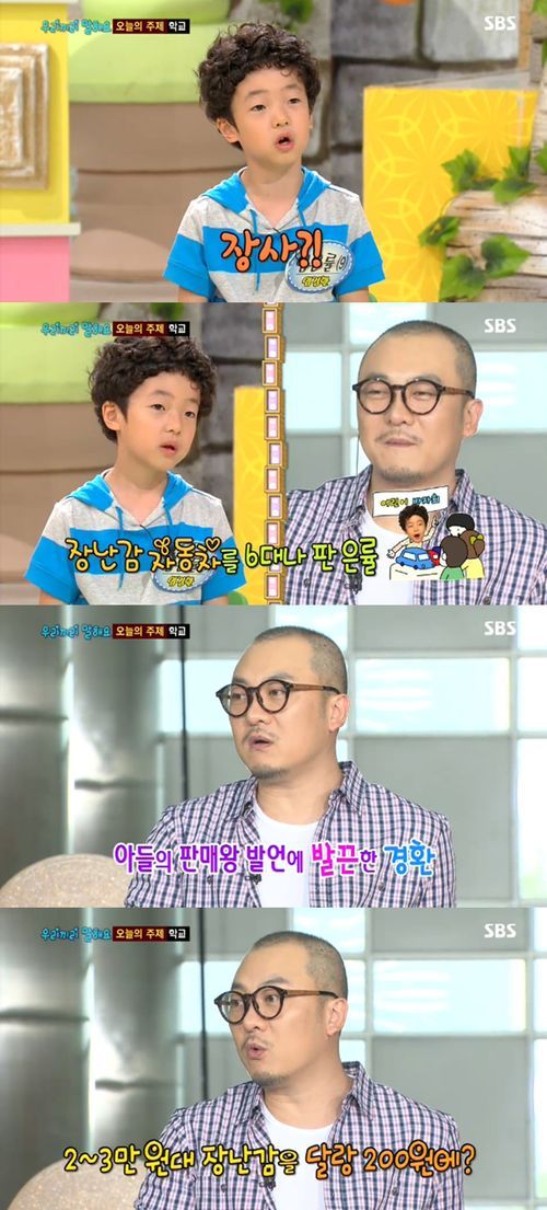 이에 염경환은 "장난감 자동차를 2~3만원에 사줬는데 바자회에서 200원에 파니까 잘 팔리지 않냐"고 아들이 판매왕에 등극한 것에 발끈했다.