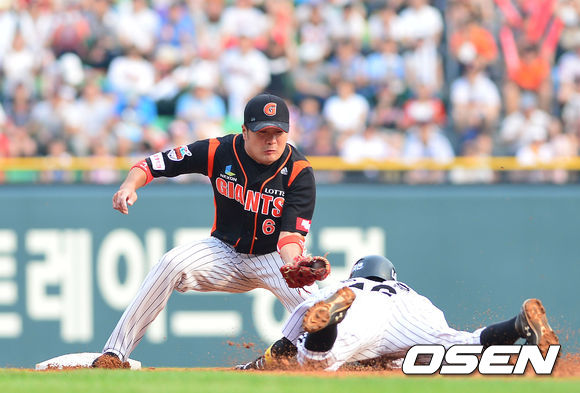 8일 오후 서울 잠실야구장에서 '2013 한국야쿠르트 세븐 프로야구' LG 트윈스 대 롯데 자이언츠의 경기가 열렸다. 2회말 LG 공격 무사 1루 7번 김용의 타석 때, 주자 정성훈이 2루 도루를 시도했으나 롯데 유격수 문규현의 태그에 걸려 아웃되고 있다.