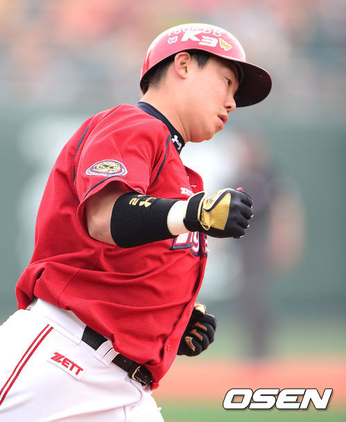 8일 오후 서울 목동야구장에서 열린 '2013 한국야쿠르트 세븐 프로야구' 넥센 히어로즈와 KIA 타이거즈의 경기, 3회초 2사 1루에서 KIA 나지완이 역전 투런포를 날리고 기뻐하고 있다.