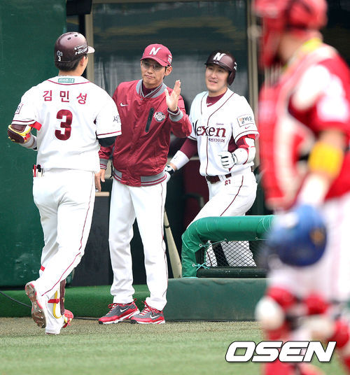 8일 오후 서울 목동야구장에서 열린 '2013 한국야쿠르트 세븐 프로야구' 넥센 히어로즈와 KIA 타이거즈의 경기, 4회말 1사에서 넥센 김민성에 동점 솔로포를 날리고 더그아웃에서 염경엽 감독과 하이파이브를 하고 있다.