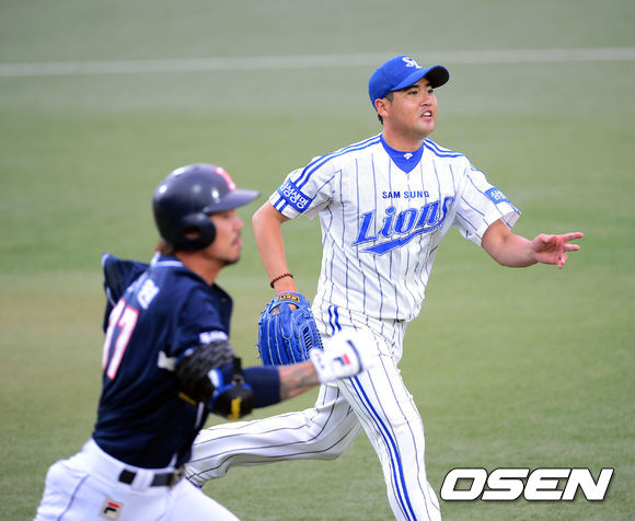 8일 오후 대구구장에서 열린 '2013 한국야쿠르트 세븐 프로야구' 삼성 라이온즈 와 두산 베어스 경기,5회초 1사 오재원 투수앞 땅볼때 삼성 장원삼이 포구하며 1루에 송구 아웃처리 시키고 있다.