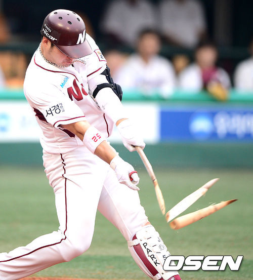 8일 오후 서울 목동야구장에서 열린 '2013 한국야쿠르트 세븐 프로야구' 넥센 히어로즈와 KIA 타이거즈의 경기, 5회말 2사 2루에서 넥센 박병호가 2루수 땅볼 타구를 날리며 방망이가 부러지고 있다.