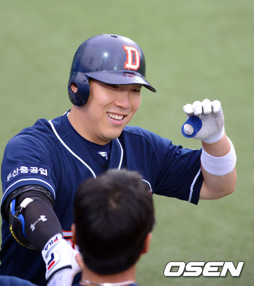 8일 오후 대구구장에서 열린 '2013 한국야쿠르트 세븐 프로야구' 삼성 라이온즈 와 두산 베어스 경기, 6회초 선두타자 김현수 우월솔로 홈런을 날리고 홈인 동료들의 환영을 받고 있다.