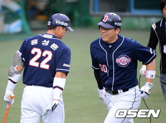 8일 오후 대구구장에서 열린 '2013 한국야쿠르트 세븐 프로야구' 삼성 라이온즈 와 두산 베어스 경기, 6회초 선두타자 김현수 우월솔로 홈런을 날리고 홈인 홍성흔의 환영을 받고 있다.