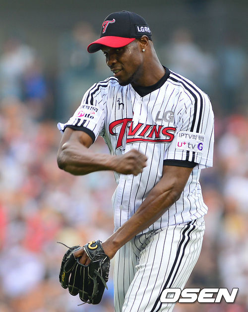 8일 오후 서울 잠실야구장에서 '2013 한국야쿠르트 세븐 프로야구' LG 트윈스 대 롯데 자이언츠의 경기가 열렸다. 6회초 롯데 공격 1사 2루 2번 이승화의 2루수 직선타 때 2루 주자 정훈까지 아웃되며 이닝이 종료되자 LG선발 리즈가 주먹을 불끈 쥐며 환호하고 있다.