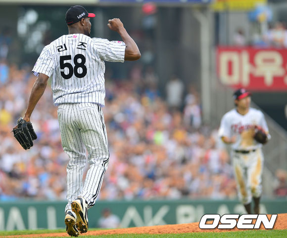 8일 오후 서울 잠실야구장에서 '2013 한국야쿠르트 세븐 프로야구' LG 트윈스 대 롯데 자이언츠의 경기가 열렸다. 6회초 롯데 공격 1사 2루 2번 이승화의 2루수 직선타 때 2루 주자 정훈까지 아웃되며 이닝이 종료되자 LG선발 리즈가 주먹을 불끈 쥐며 환호하고 있다.