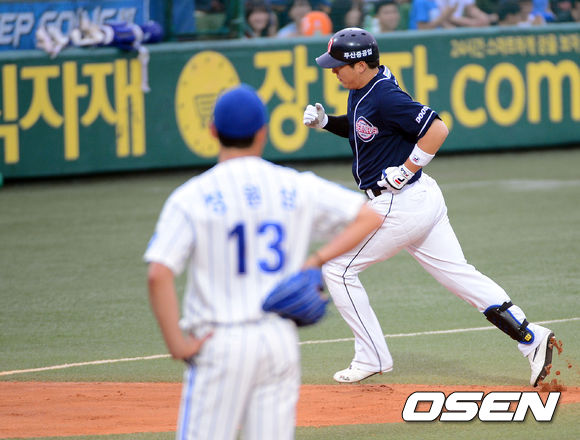 8일 오후 대구구장에서 열린 '2013 한국야쿠르트 세븐 프로야구' 삼성 라이온즈 와 두산 베어스 경기, 6회초 선두타자 김현수 우월솔로 홈런을 날리고 그라운드를 돌며 홈인하고 있다.