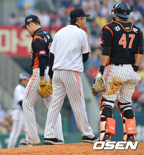 8일 오후 서울 잠실야구장에서 '2013 한국야쿠르트 세븐 프로야구' LG 트윈스 대 롯데 자이언츠의 경기가 열렸다. 6회말 LG 공격 무사 1, 2루 상황 롯데 선발 고원준이 마운드를 내려가고 있다.