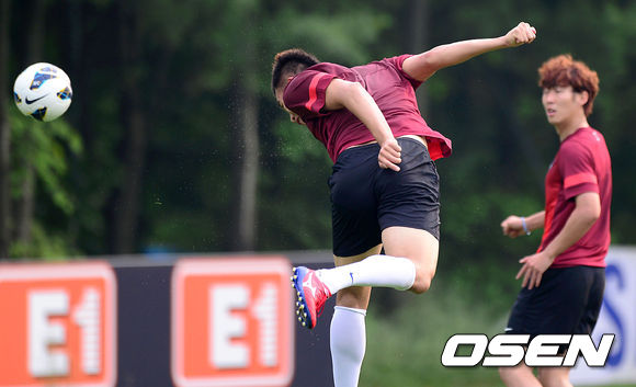 김신욱이 세트피스 훈련에서 헤딩슛을 시도하고 있다.