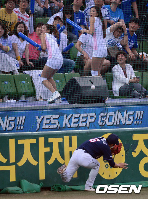 8일 오후 대구구장에서 열린 '2013 한국야쿠르트 세븐 프로야구' 삼성 라이온즈 와 두산 베어스 경기, 7회말 2사 김상수의 파울 타구때 두산 허경민 3루수가 수비를 펼치고 있다.