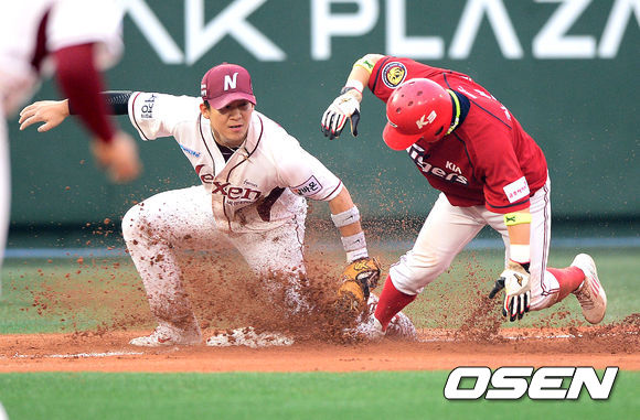 8일 오후 서울 목동야구장에서 열린 '2013 한국야쿠르트 세븐 프로야구' 넥센 히어로즈와 KIA 타이거즈의 경기, 7회초 1사 1,2루에서 3루 도루를 시도한 KIA 김선빈이 넥센 김민성에 태그아웃당하고 있다.