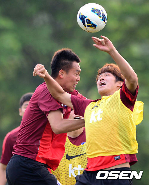 김신욱과 정인환이 미니게임에서 공중볼 다툼을 하고 있다.
