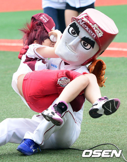 8일 오후 서울 목동야구장에서 열린 '2013 한국야쿠르트 세븐 프로야구' 넥센 히어로즈와 KIA 타이거즈의 경기, 경기에 앞서 턱돌이가 시구를 마친 딜라잇 태희를 안다가 넘어지고 있다.
