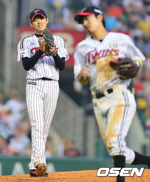 8일 오후 서울 잠실야구장에서 '2013 한국야쿠르트 세븐 프로야구' LG 트윈스 대 롯데 자이언츠의 경기가 열렸다. 8회초 롯데 공격 선두타자로 나선 6번 전준우를 3루수 땅볼로 이끈 LG 투수 임정우가 멋진 수비를 펼친 3루수 정성훈을 바라보며 박수치고 있다.