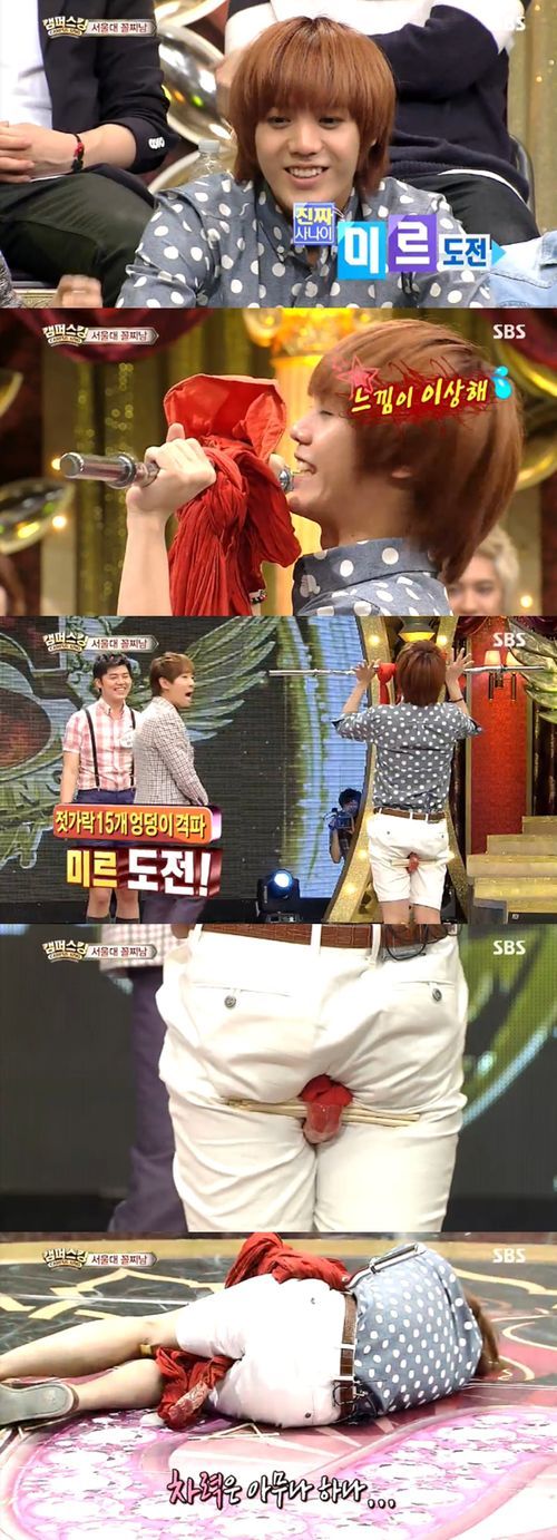 그룹 엠블랙 멤버 미르가 엉덩이 젓가락 격파레 실패해 굴욕을 당했다.