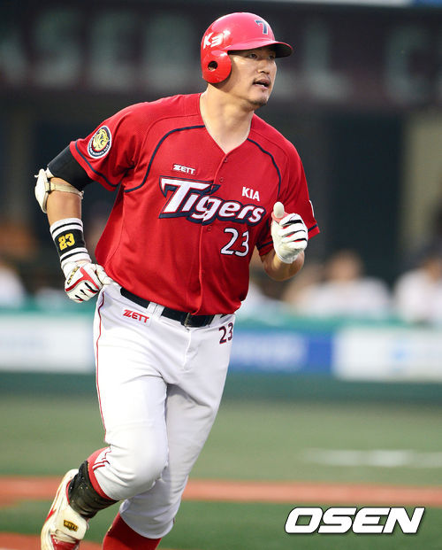 8일 오후 서울 목동야구장에서 열린 '2013 한국야쿠르트 세븐 프로야구' 넥센 히어로즈와 KIA 타이거즈의 경기, 8회초 무사에서 KIA 최희섭이 솔로포를 날리고 그라운드를 돌고 있다.