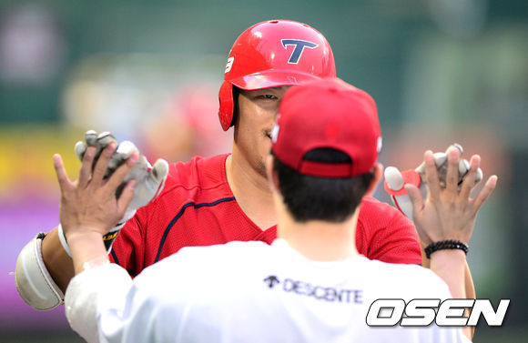 8일 오후 서울 목동야구장에서 열린 '2013 한국야쿠르트 세븐 프로야구' 넥센 히어로즈와 KIA 타이거즈의 경기, 8회초 무사에서 KIA 최희섭이 솔로포를 날리고 더그아웃에서 양현종과 하이파이브를 하며 기뻐하고 있다.