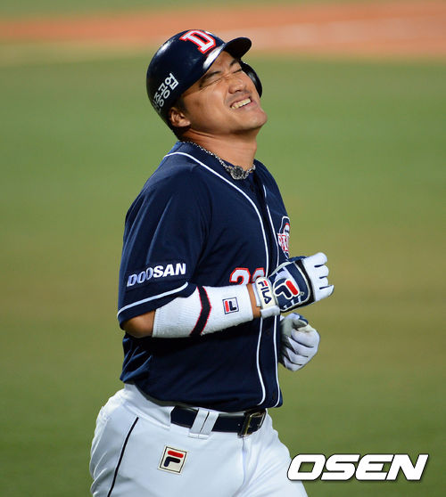 8일 오후 대구구장에서 열린 '2013 한국야쿠르트 세븐 프로야구' 삼성 라이온즈 와 두산 베어스 경기, 9회초 2사 홍성흔 우익수플라이로 물러나며 아쉬워하고 있다.