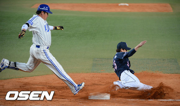 8일 오후 대구구장에서 열린 '2013 한국야쿠르트 세븐 프로야구' 삼성 라이온즈 와 두산 베어스 경기, 9회말 선두타자 진갑용의 1루수앞 안타때 두산 오현택 투수가 백업수비를 펼쳤으나 송수실책으로 타자주자를 2루까지 진루시켰다.