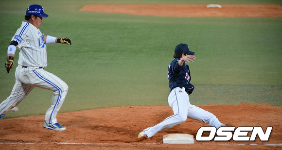 8일 오후 대구구장에서 열린 '2013 한국야쿠르트 세븐 프로야구' 삼성 라이온즈 와 두산 베어스 경기, 9회말 선두타자 진갑용의 1루수앞 안타때 두산 오현택 투수가 백업수비를 펼쳤으나 송수실책으로 타자주자를 2루까지 진루시켰다.