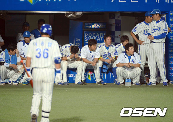8일 오후 대구구장에서 열린 '2013 한국야쿠르트 세븐 프로야구' 삼성 라이온즈 와 두산 베어스 경기,9회말 1사 만루 이승엽이 내야플라이 아웃으로 물러나며 덕아웃을 향하고 있다.