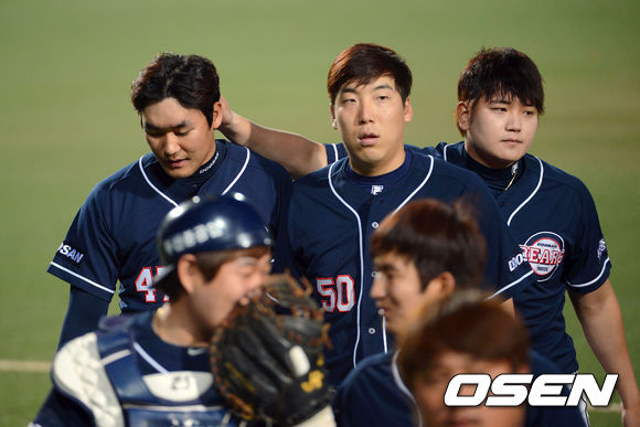 이틀연속 끝내기 홈런을 허용한 홍상삼 선수가 동료들의 위로를 받으며 덕아웃을 향하고 있다 ./ ajyoung@osen.co.kr