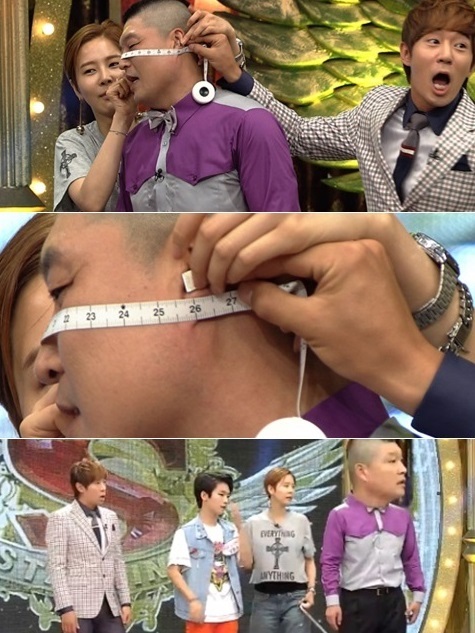 이어 붐은 "강호동의 머리둘레도 궁금하다"며 즉석에서 직접 측정에 나섰고, 그 결과 강호동의 머리둘레는 26인치로 밝혀졌다.