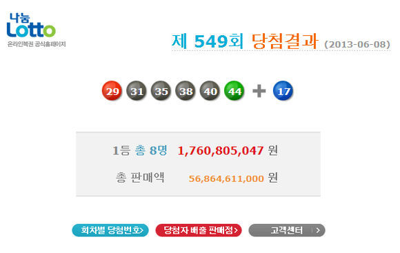8일 결정된 이번 주 549회 당첨번호는 1, 12, 13, 21, 32, 45였고 보너스는 17이었다. 당첨번호 6개를 모두 맞힌 1등 당첨자는 총 8명이었다. 당첨액은 각 17억6080만5047원씩이다.