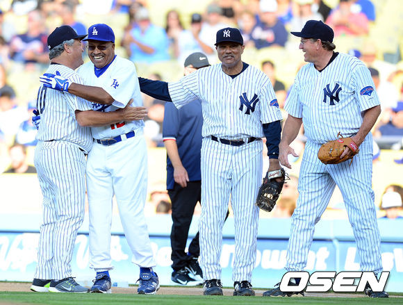9일 오전(이하 한국시간) 미국 캘리포니아주 로스앤젤레스 다저스타디움에서 열리는 LA 다저스와 애틀랜타 브레이브스의 경기 시작 전 열린 '올드 타이머 게임'(Old Timers' Game)에 참석한 선수들이 인사를 나누고 있다.