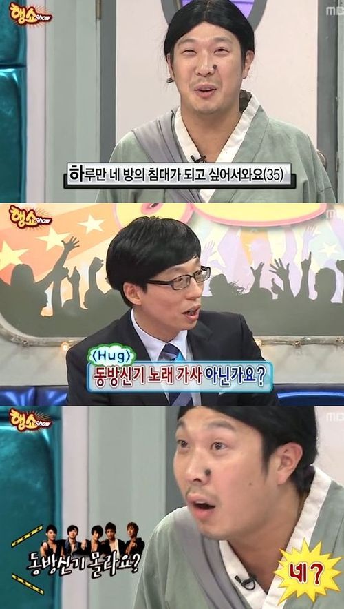 이날 방송에서 순수 총각으로 분한 하하는 "동방신기 노래 가사 아니냐"는 유재석의 말에 "네?"라고 반문한 뒤 "몰라서 죄송하다"며 능청스런 연기를 펼쳤다. 그러나 이내 성인 '하'와 속옷 브랜드 이름을 합한 가족들의 이름을 소개해 엉뚱한 웃음을 유발했다.