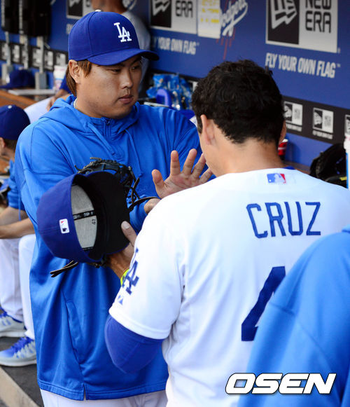 9일 오전(이하 한국시간) 미국 캘리포니아주 로스앤젤레스 다저스타디움에서 열린 LA 다저스와 애틀랜타 브레이브스의 경기 시작 전 류현진이 크루스와 '장풍' 세레모니를 하고 있다.