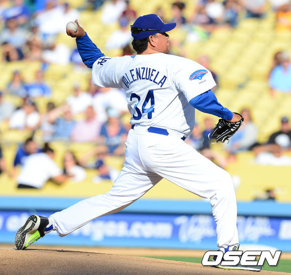 9일 오전(이하 한국시간) 미국 캘리포니아주 로스앤젤레스 다저스타디움에서 열린 LA 다저스와 애틀랜타 브레이브스의 경기 시작 전, '올드 타이머 게임'(Old Timers' Game)에서 발렌수엘라가 공을 던지고 있다.